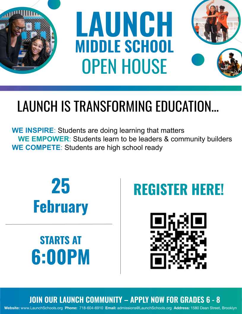 Launch Middle School is a tuition-free, public charter school in Brooklyn serving grades 6-8. For nearly 15 years, we have helped students grow into confident learners, critical thinkers, and compassionate leaders.